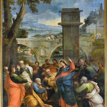 Le sujet maintes fois représenté en peinture, rapporte l’épisode où le Christ offre à saint Pierre la clé de l’Eglise en reconnaissance de sa fidélité : « Tu es Pierre et sur cette pierre je bâtirai mon église. Je te donnerai les clés du royaume des cieux et tout ce que tu lieras sur terre sera lié dans les cieux ».
